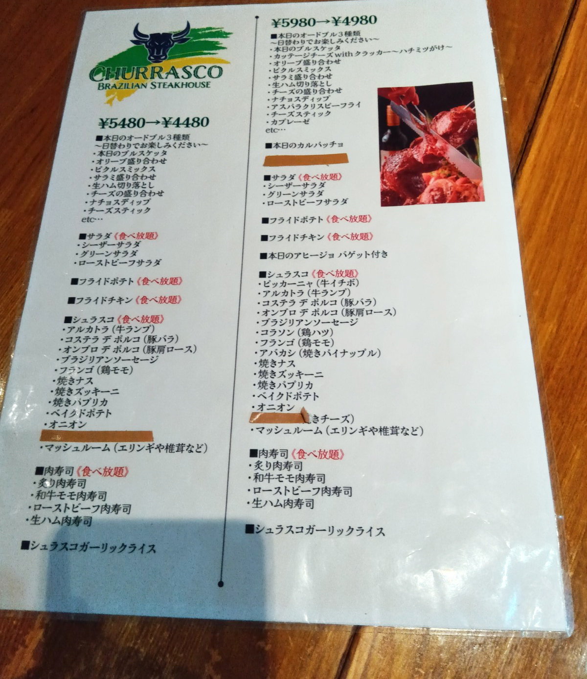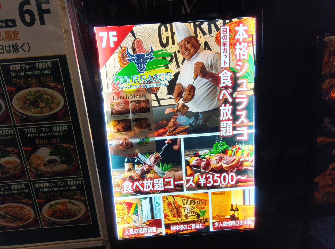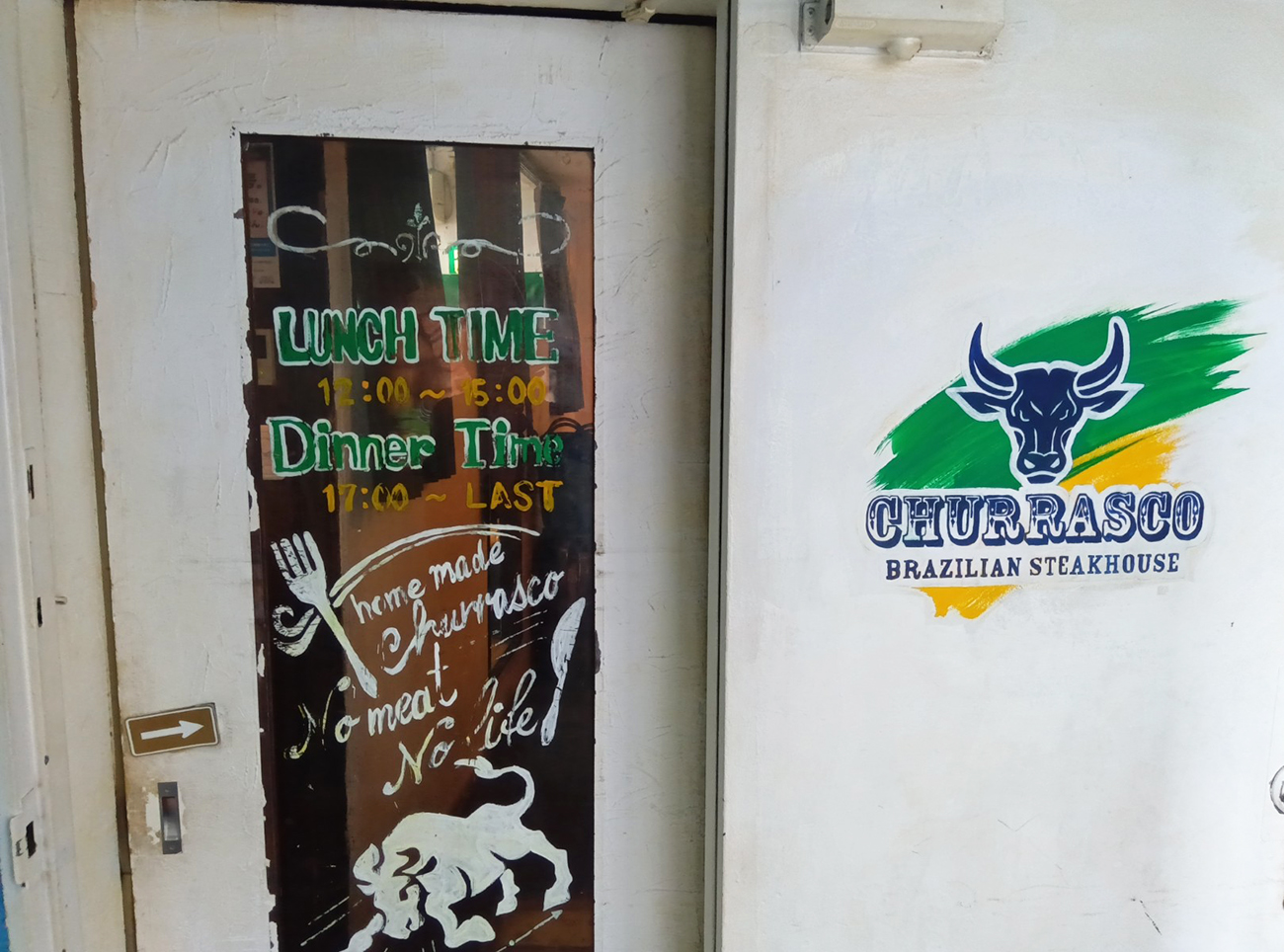 そう考えていた矢先、気になる店を発見した。MEGAドンキ渋谷の向かいくらいだろうか? 飲食店が入った雑居ビルの前を歩く度に目に飛び込んでくる看板がある。そこにはこう書かれているのだ。「本格シュラスコ食べ放題 食べ放題コース3500円~」と。