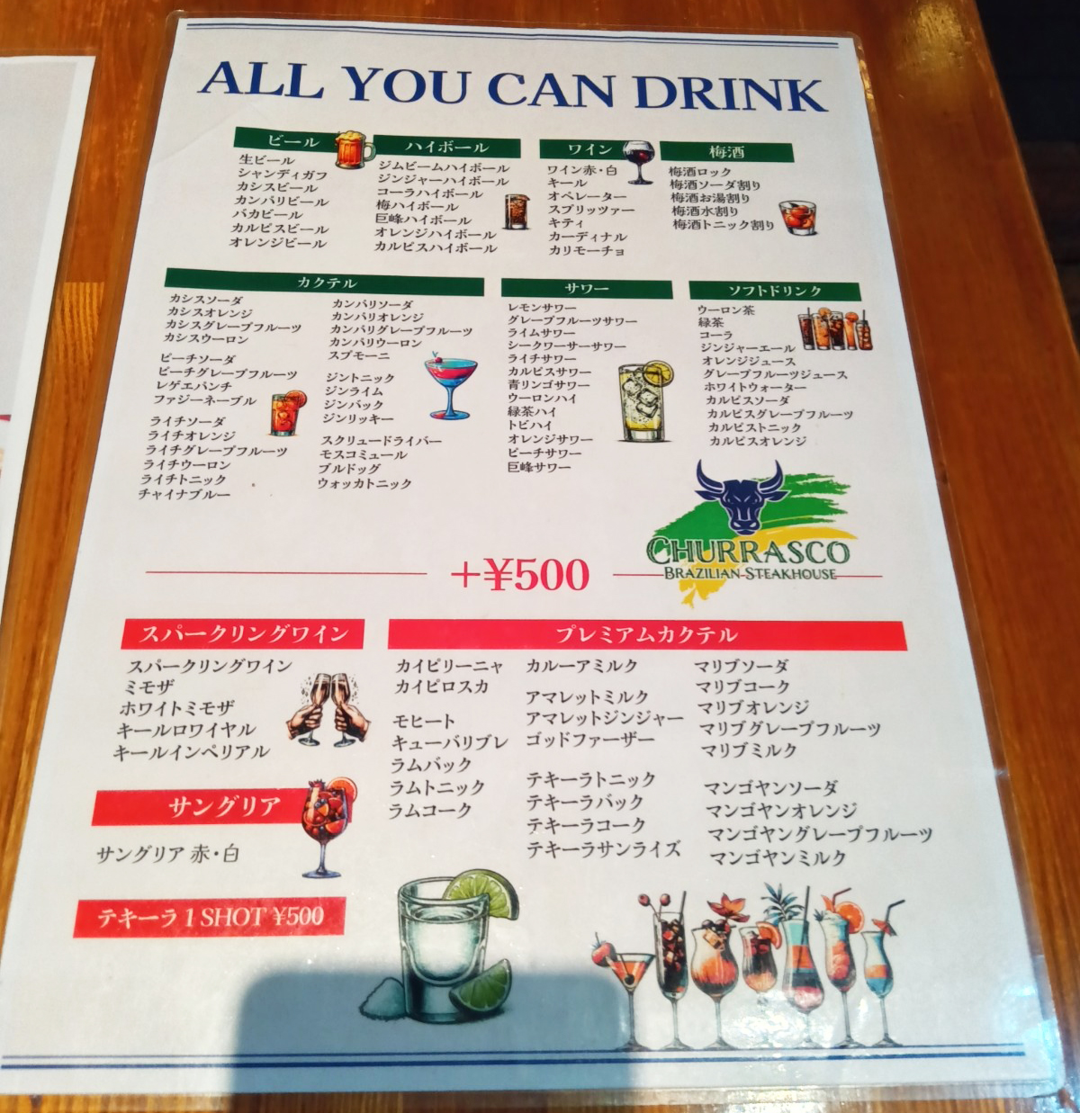食べ放題のみのコースの場合ワンドリンクは必須。そして、ドリンクはアルコールもソフトドリンクも一律500円となっている。ふむふむ、つまり最安4980円になるわけか。