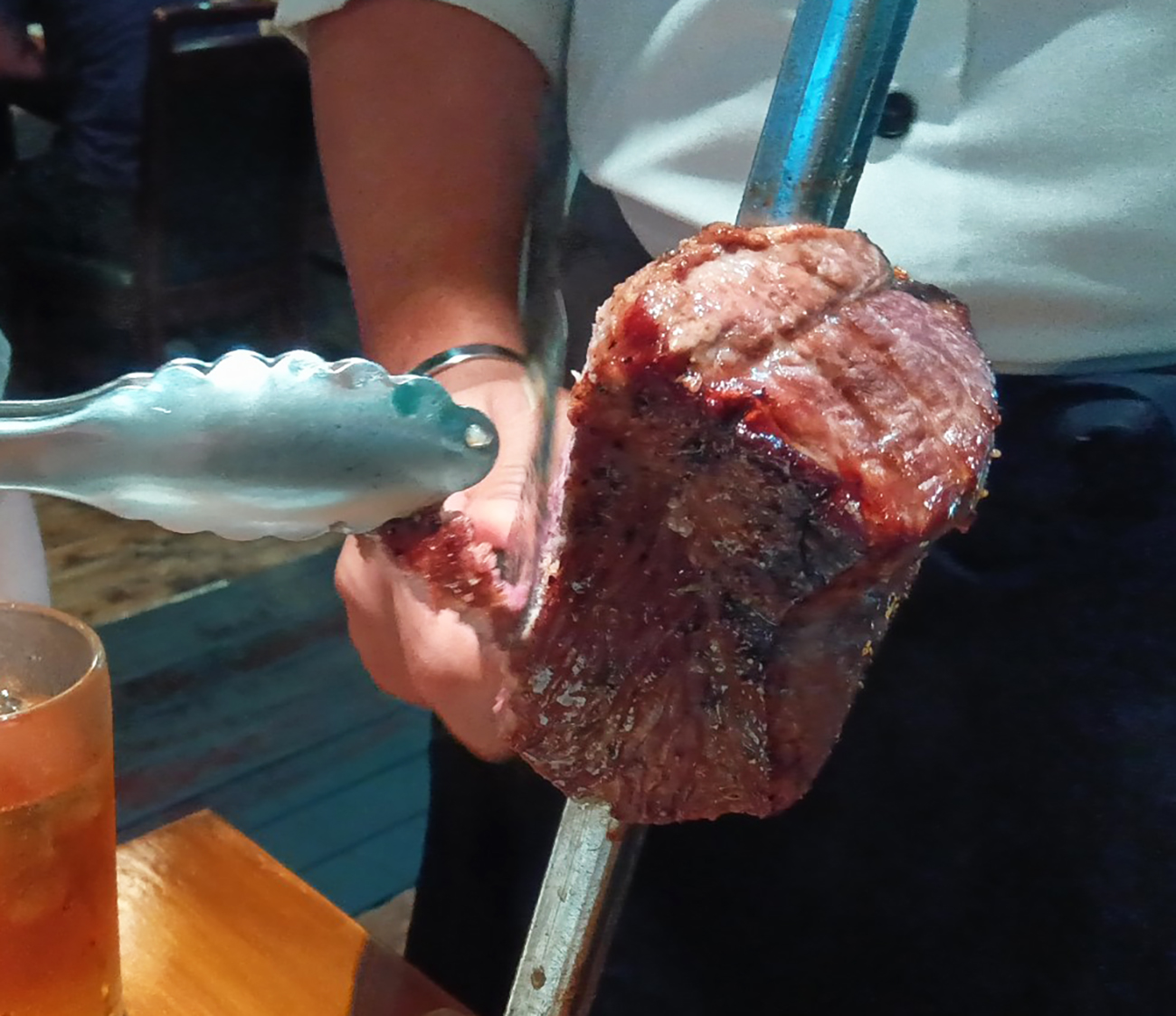 シュラスコとはブラジルスタイルのBBQ。串に肉塊を刺して焼いた後、切り落として食べるという豪快なもので、その豪快さも相まって「肉食ってるな!」って感じがする料理だ。参考までに言うと、シュラスコで有名な『バルバッコア』の渋谷店は平日ランチが5500円、休日ランチとディナーは8000円である。
