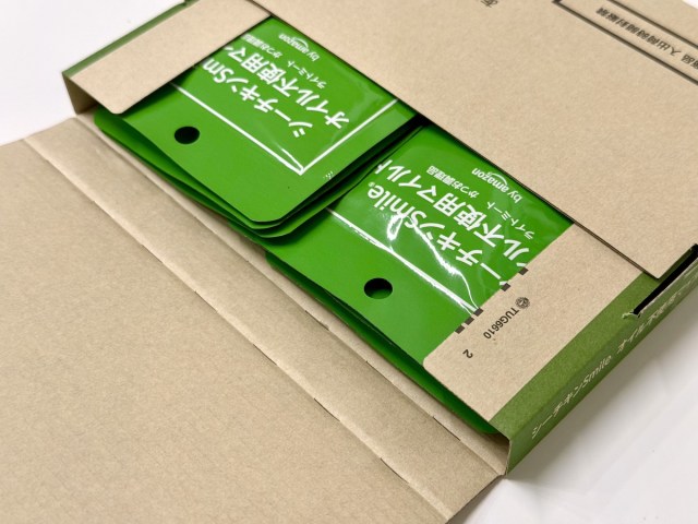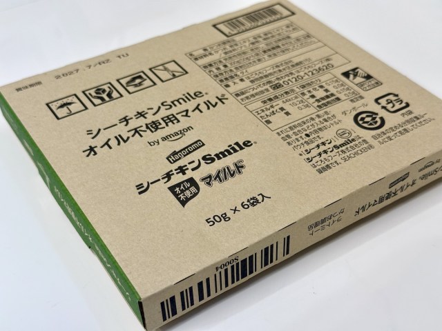 購入したのはこちら、「by Amazon シーチキンSmile オイル不使用 マイルド」。置き配されているのを見たときは、書籍かと思うくらいコンパクトなボックスで届いた。