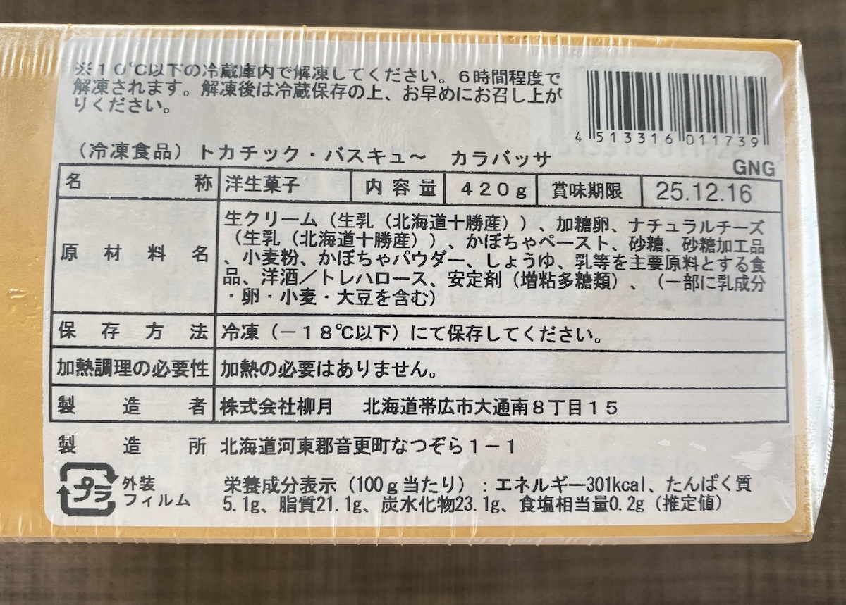 個人的に「はじめまして」なのだが、調べたらどうやら知る人ぞ知るバスクチーズケーキらしい。北海道の創業1947年の老舗「柳月」が手がけていて、この「カラバッサ」はコロナ禍の2021年に初登場した商品だそうな。