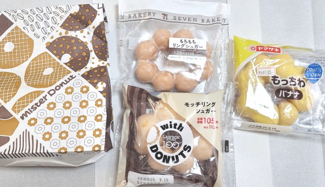 そういうわけで、筆者は本家ミスタードーナツ、前述のセブンイレブン、加えて新たに見つかった100円ローソン、およびヤマザキの商品を並べ、まことに勝手ながら王位争奪戦を催すことにした。