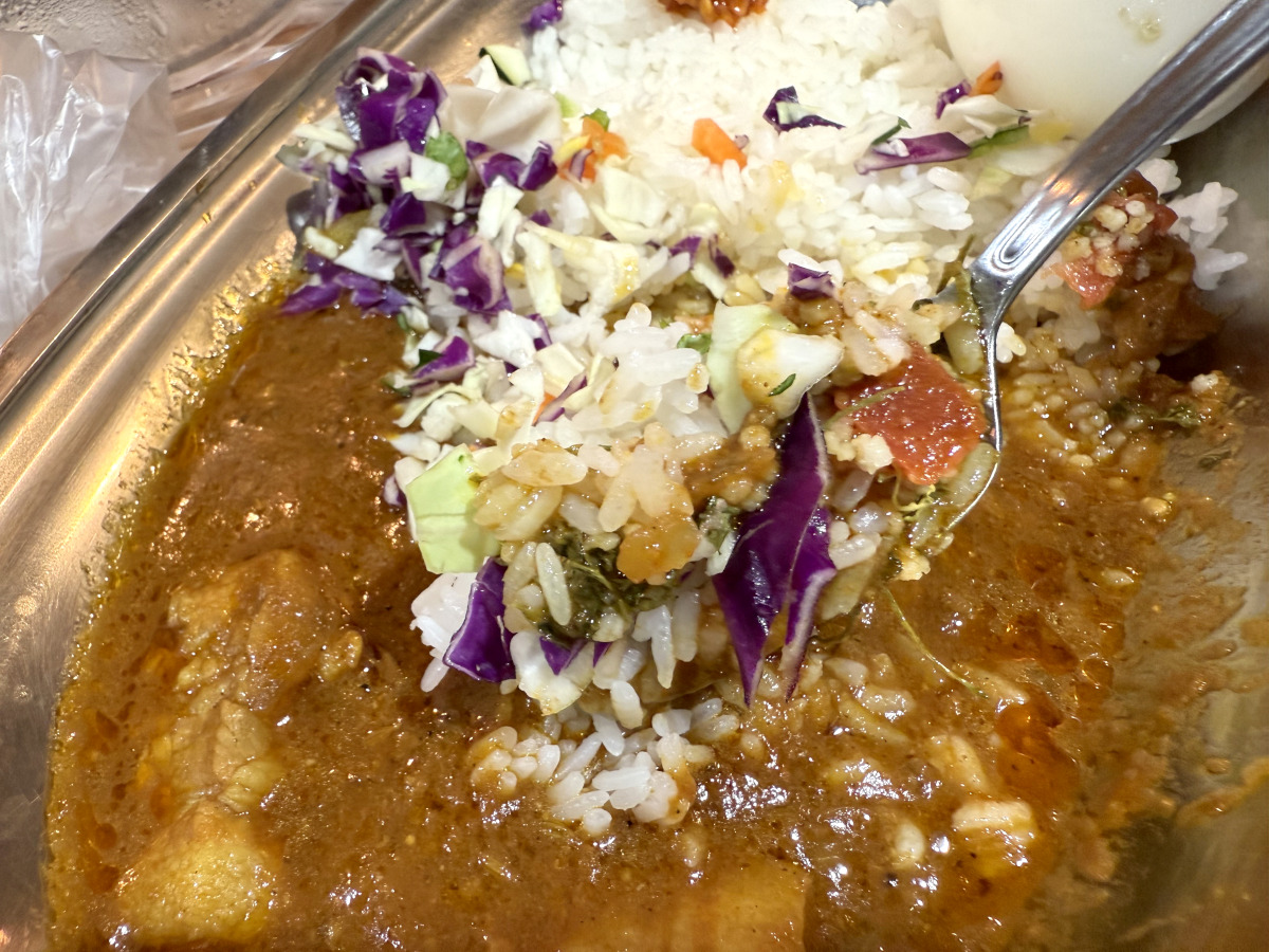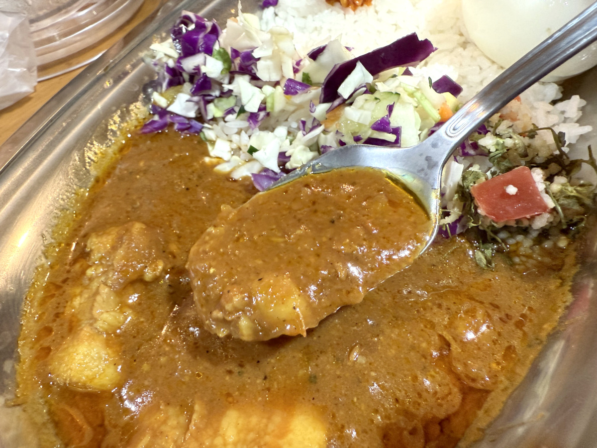 一口食べてみると、とんでもなく酸味が強い! というかここまで酸味が立ったカレーは食べたことが無い!! それはエリックサウスともまた違った方向性で「酸味に振りまくったポークビンダルー」といった感じだろうか?