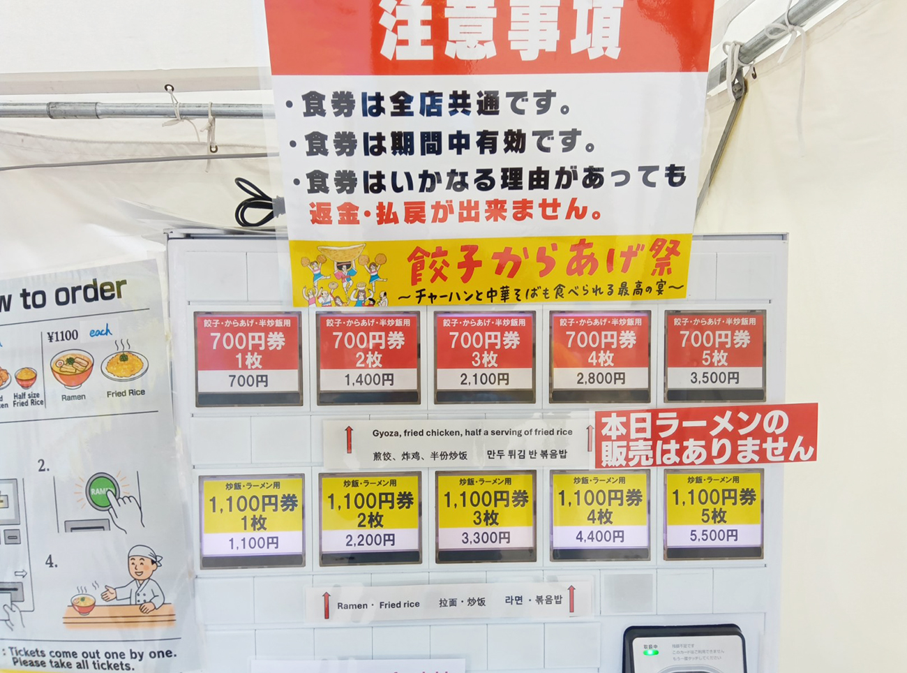 そんなわけで入口の券売機を見てみたところチケットは1枚700円。このチケットを購入して商品と交換してもらう形だ。ザッと店を見ると、餃子とからあげは全部700円なので大体1チケット1品と考えていいだろう。