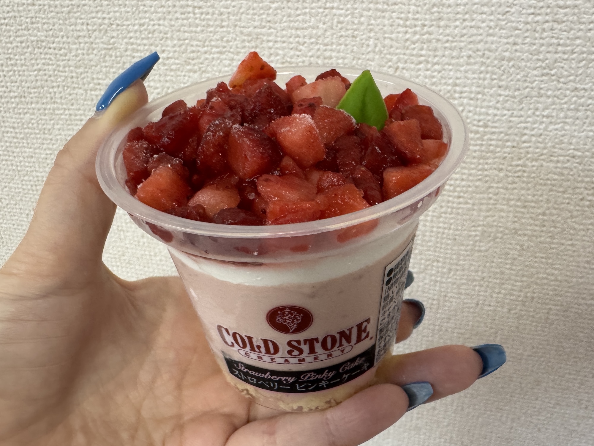 「コールドストーンといえば『ワッフルボール』に入ったアイス。中でもストロベリーがド定番」と友人2人の意見が一致したので、迷うことなく『ストロベリーピンキーケーキ』をチョイスだ。