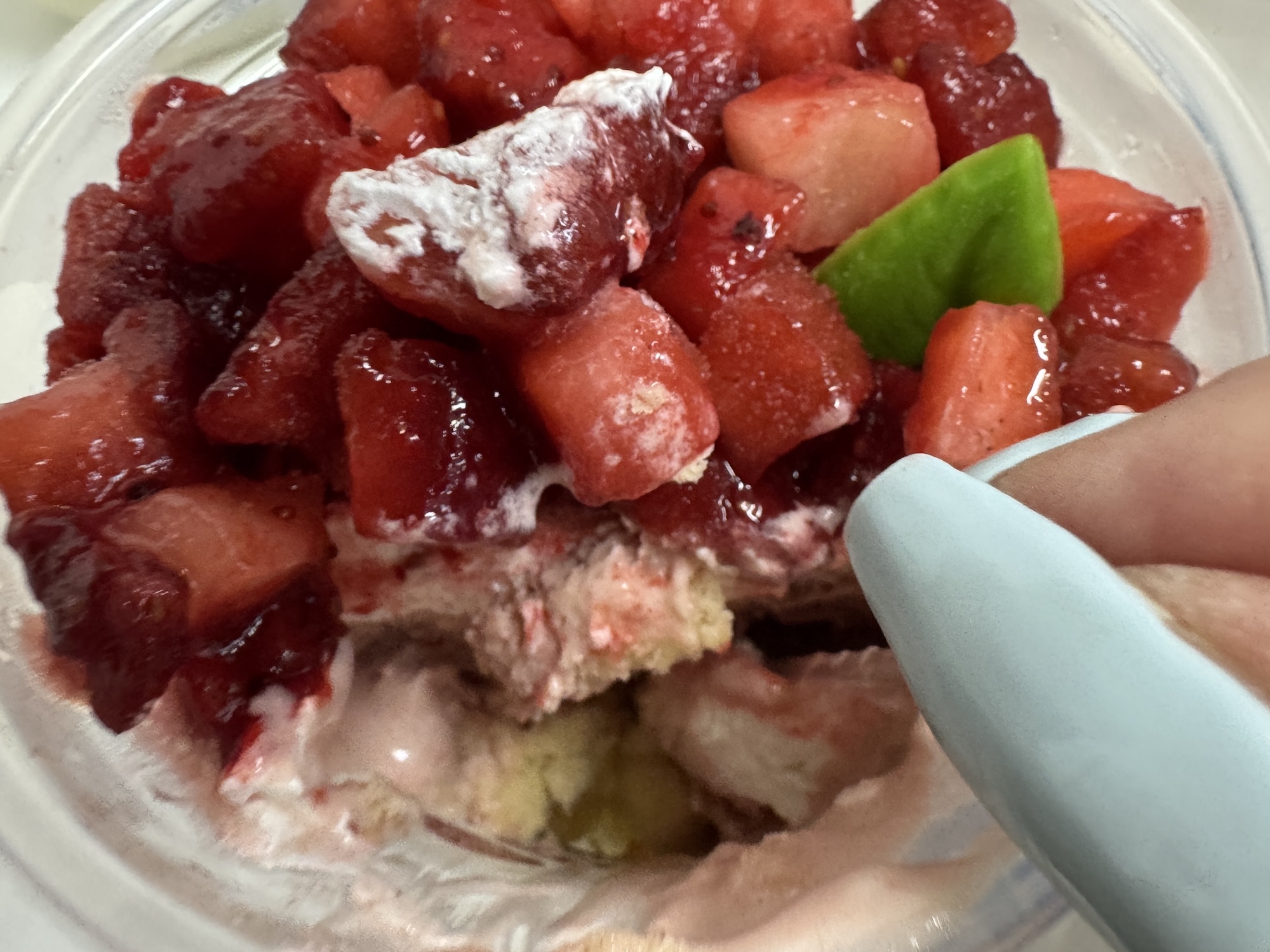 上部にはキンキンに凍った生イチゴの角切りが乗っている。スプーンが折れるレベルのカチンコチンを想定していたら、意外とスルッとすくえた。口に入れると…………ファーーー!!! キンキンのイチゴが知覚過敏に特大のダメージを与えるゥ!!!!