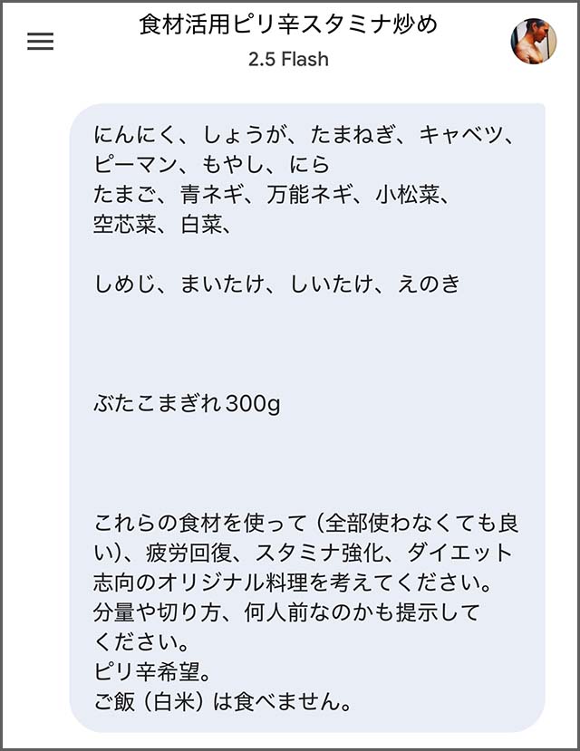 日々、この食材の部分だけをその日の食材に書き換えて、3つの生成AIにぶつけるのだ。すると、たとえばGoogleのGemini(ジェミニ)の場合、