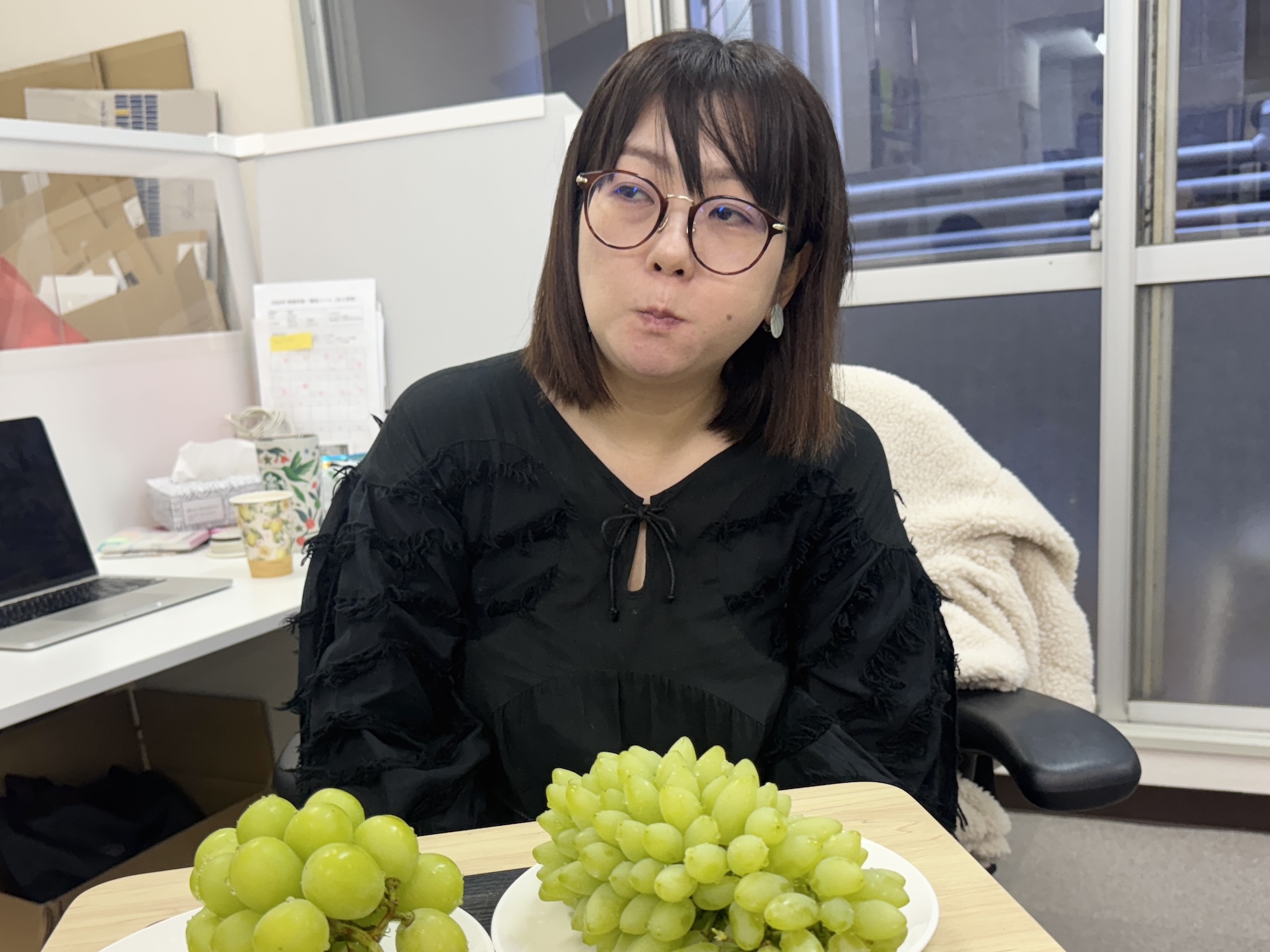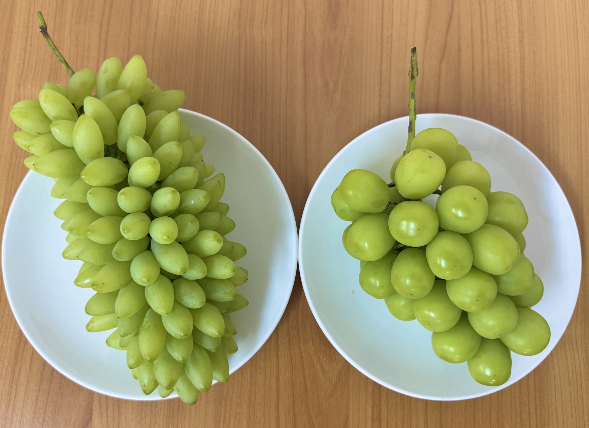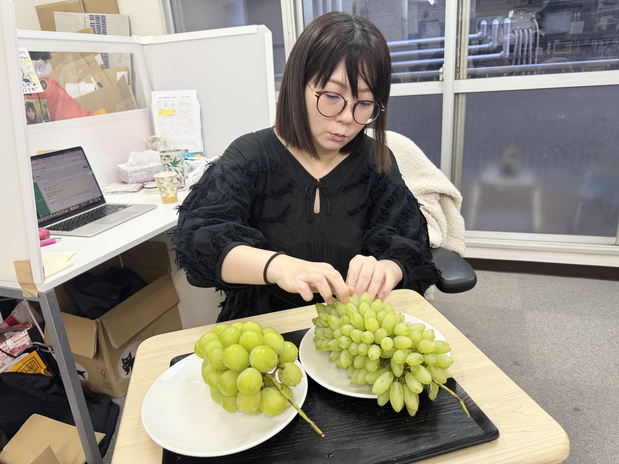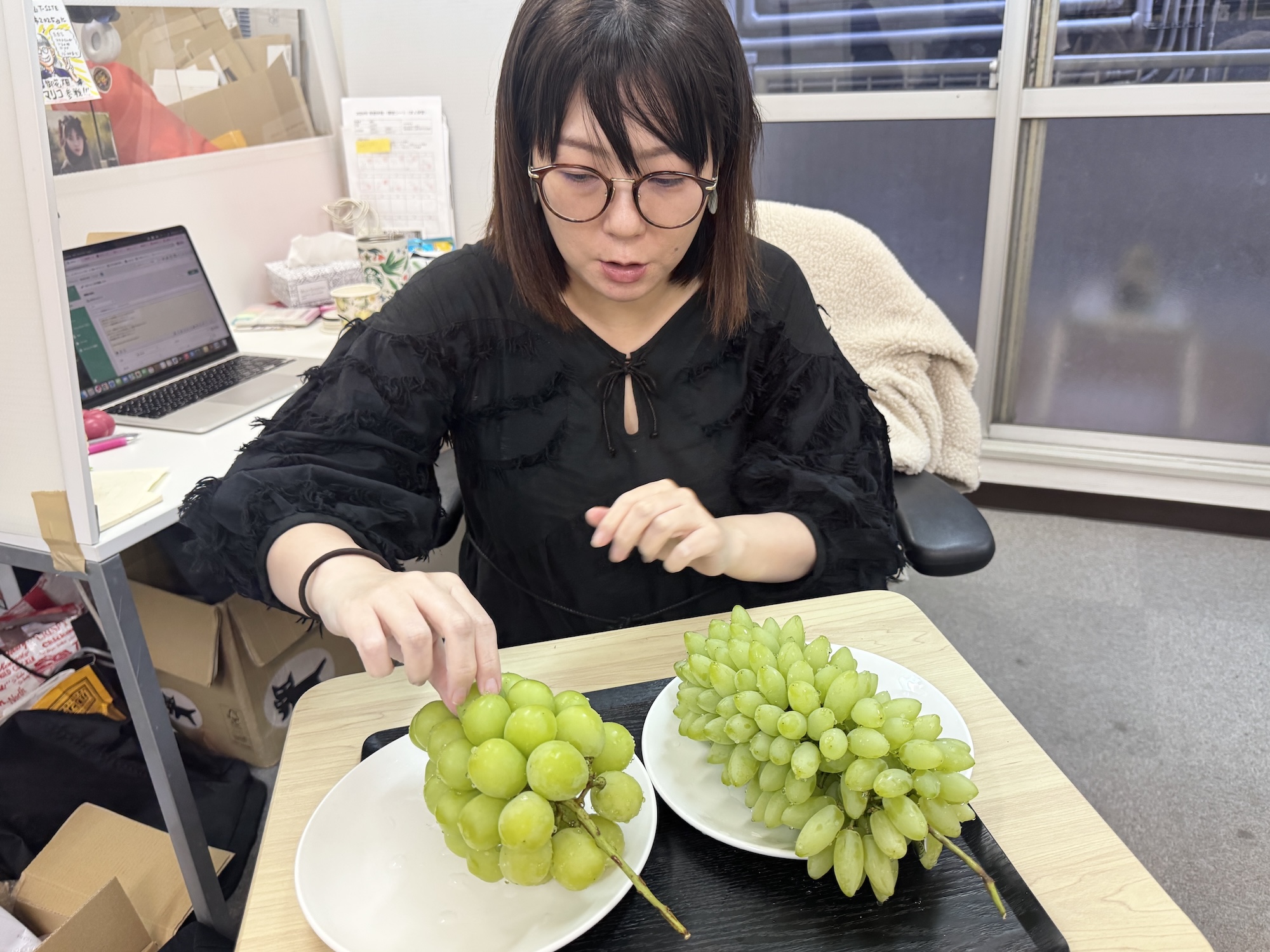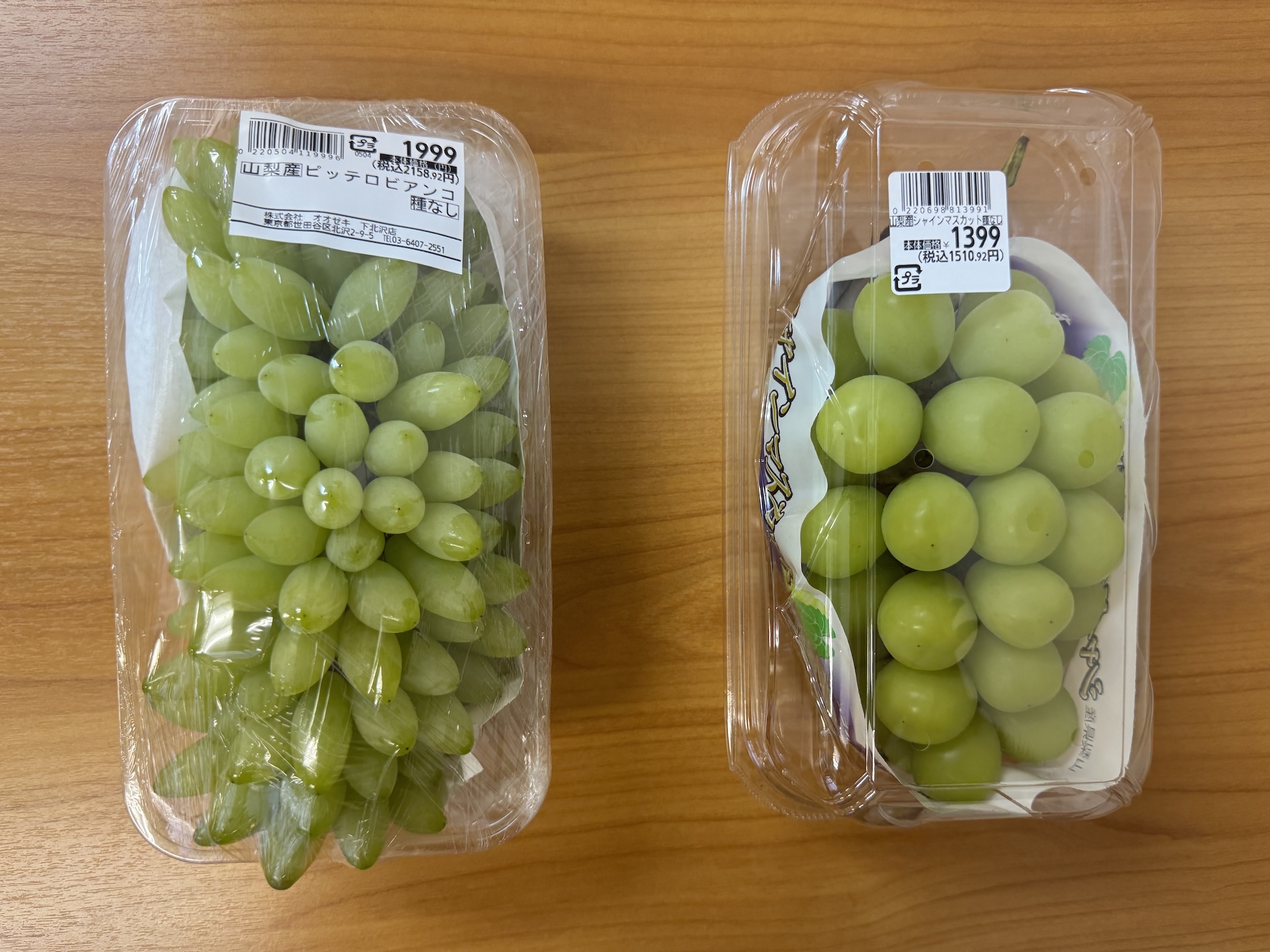 とりあえずシャインマスカット有識者の御花畑記者に2つを食べ比べてもらうことにした。毎年この時期になると様々なシャインマスカットを食べている彼女だが、近年「やはり岡山と山梨産は別格」という結論に辿り着いたのだそうな。山梨産買っといてよかった〜!