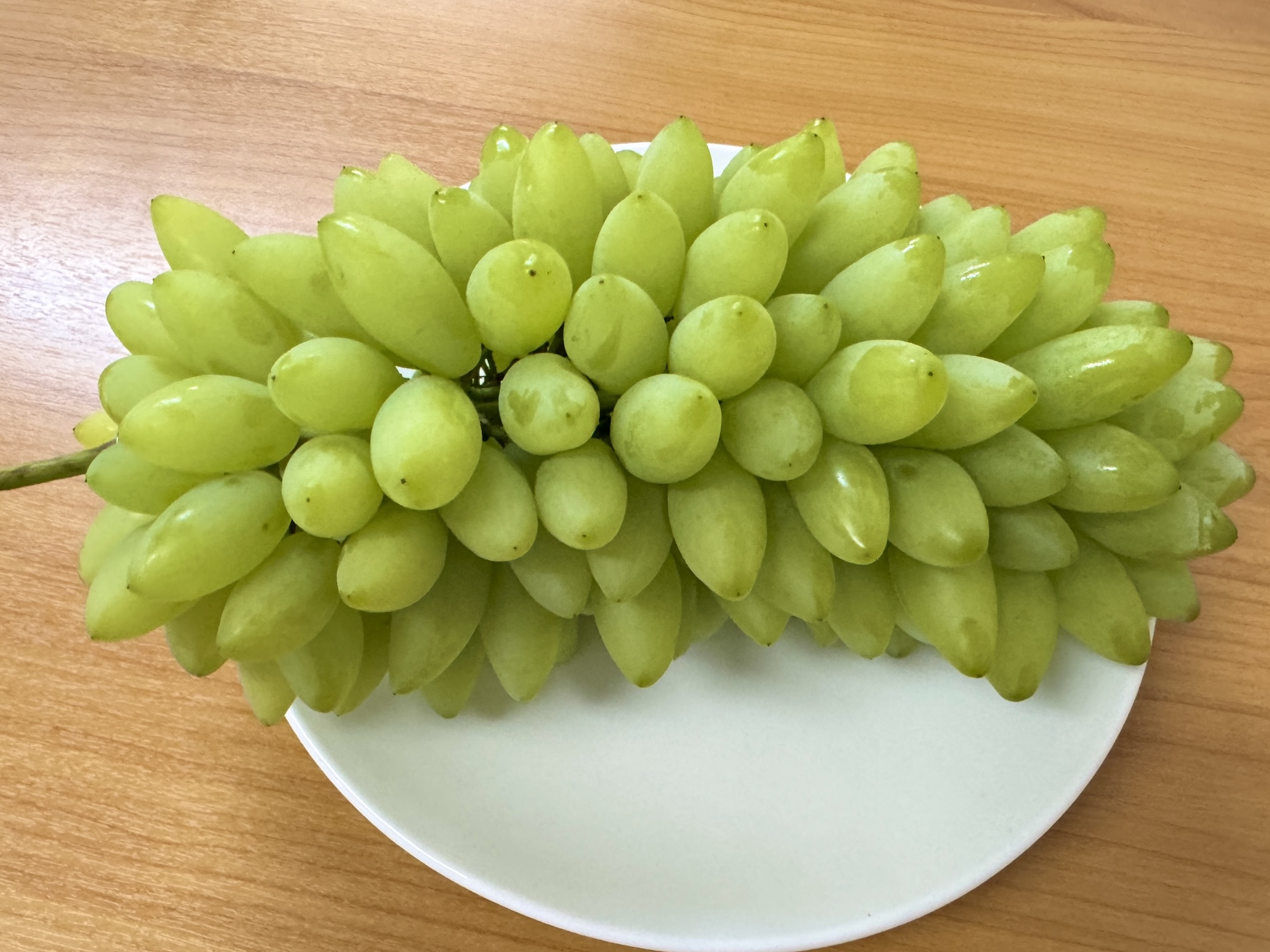 ナマコのようにグネグネと身をくねらせる『ピッテロビアンコ』は、どちらかといえば槍より “強いこんぼう” っぽい。今回購入した個体は一般的なシャインマスカットの2倍くらいのサイズ感で、粒が100個くらいついていそう。