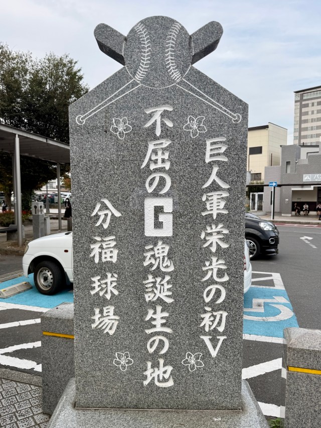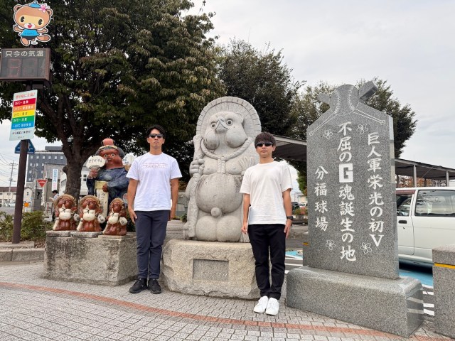 さらに駅前には「巨人軍栄光の初V 不屈のG魂誕生の地」と刻まれた石碑が立っている。調べたところ、館林はジャイアンツが初優勝を遂げた1936年にキャンプを張った「分福球場」の所在地だという。プロ野球ファンならグッとくる歴史的スポットである。