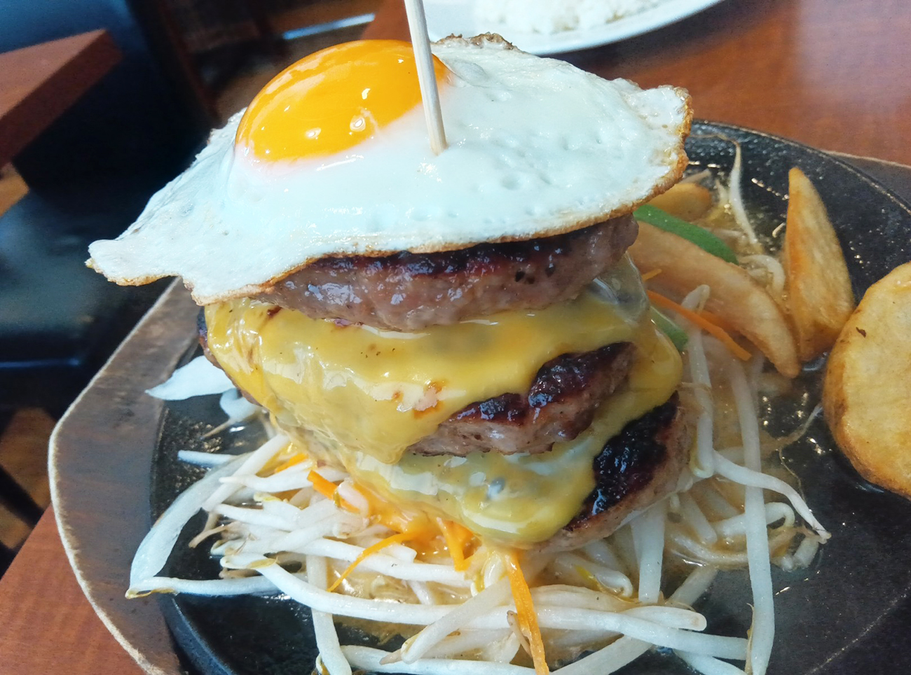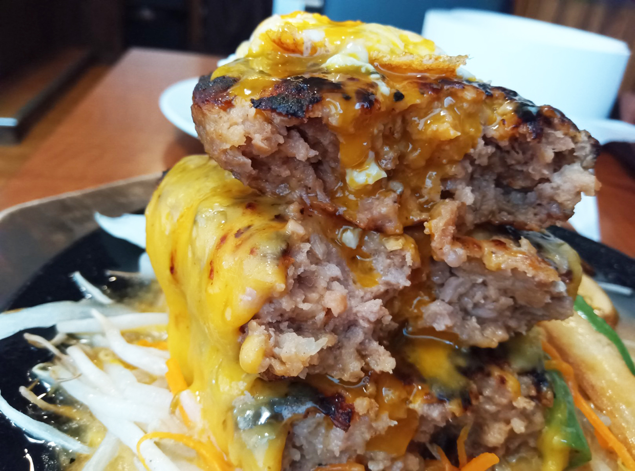 本チャンのメニューには「MEGAハンバーグ(税込2680円)」という爆盛りハンバーグがあった。合挽ハンバーグ3枚540gで間にチーズが挟まり、さらに目玉焼きまで乗っている。そのハンバーグの圧に屈してついつい注文しちゃった。てへ。