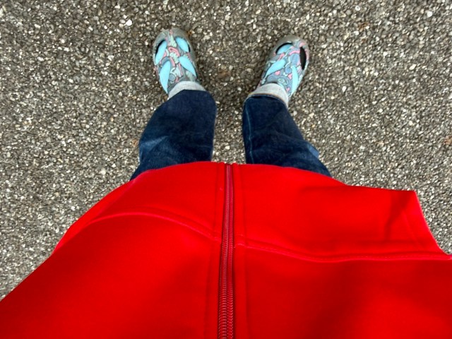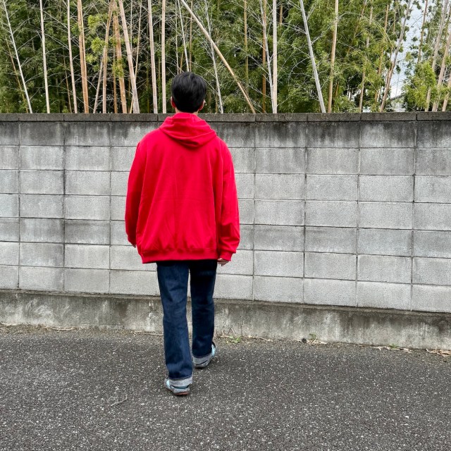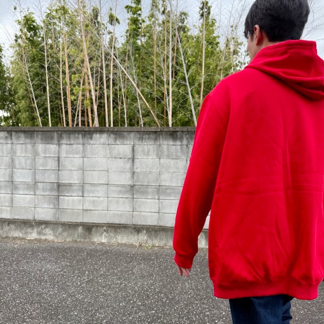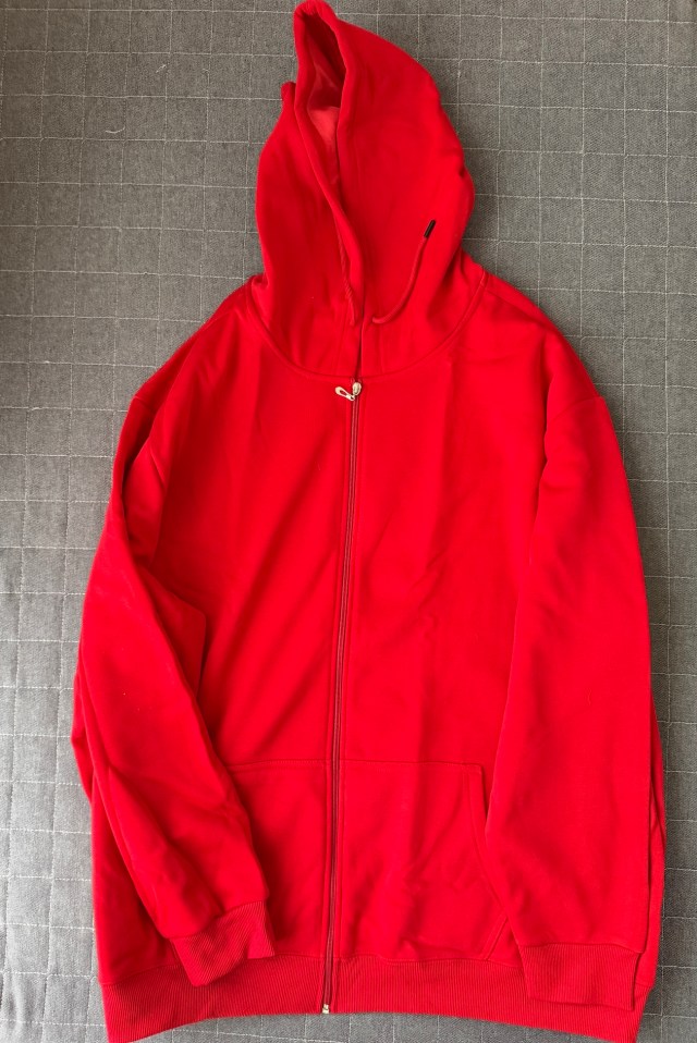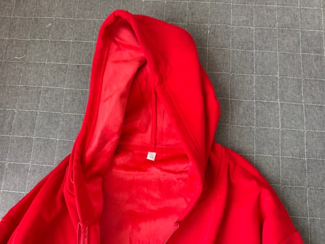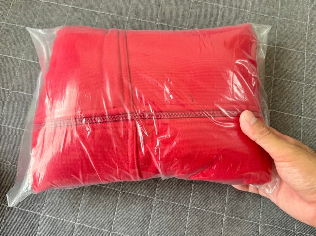 さっそく袋を破って中身を取り出すと、やはりほぼクッションみたいな赤いパーカーが現れた。こ、これが12XLサイズのボリューム……デケェェ。
