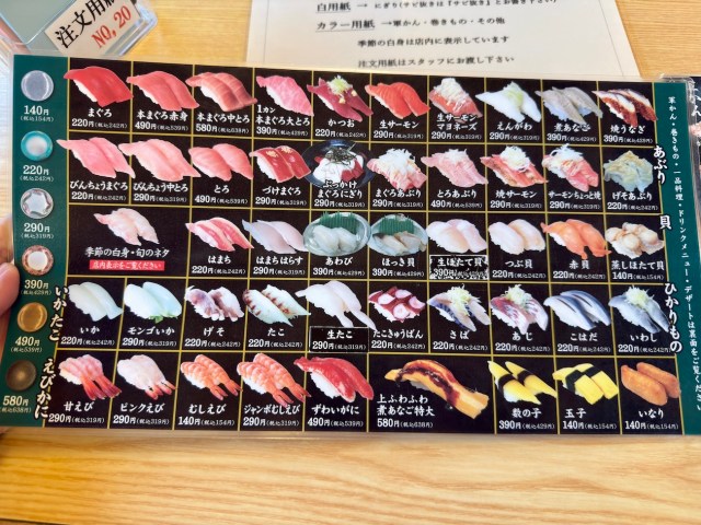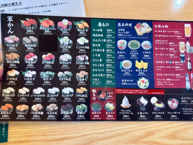 さて、注文はメモ用紙に食べたいネタを書いて店員さんに渡す方式で、白用紙が「にぎり」、カラー用紙が「軍かん・巻きもの・その他」とのこと。んで、メニューはというと……これが超豪華!