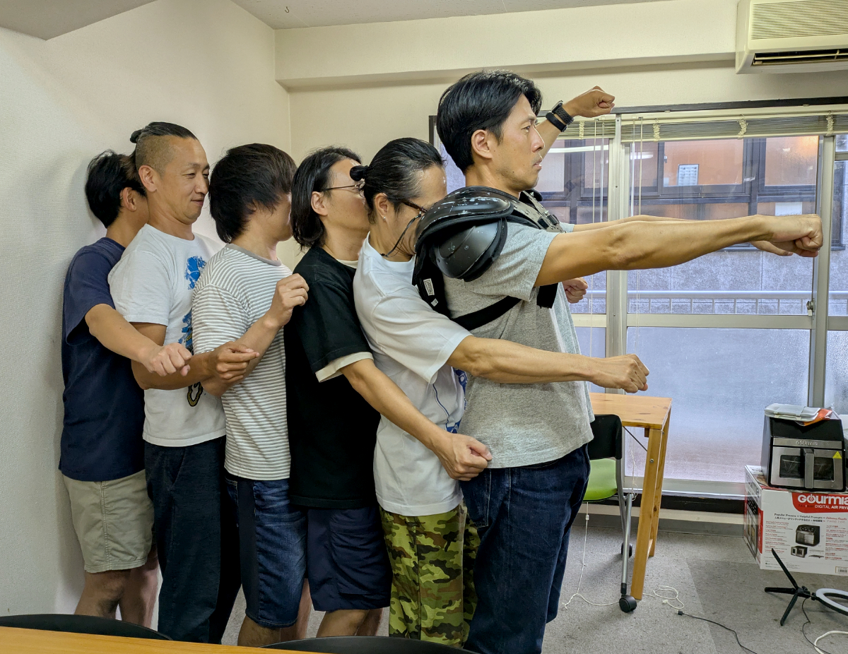 ちょっとポジションチェンジしよう。後ろからじゃ届かないから、お前とお前、前に来い。そんで片手でいいから前に出して。そうそう。で、こっち向かないように。