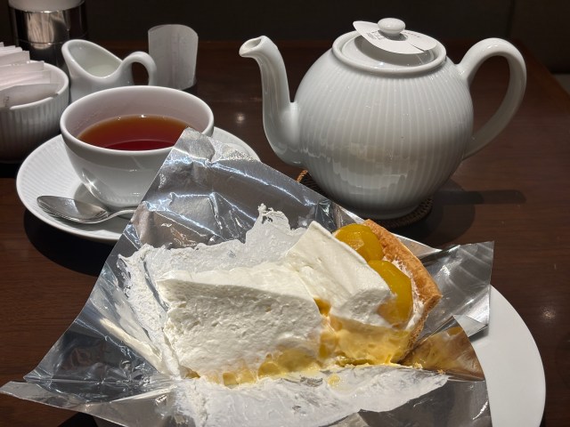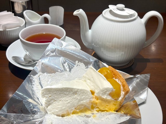今の時期は洋梨と栗のケーキを推していたので、マロンパイ(930円)と、アッサムティー(HOT 900円)を注文。