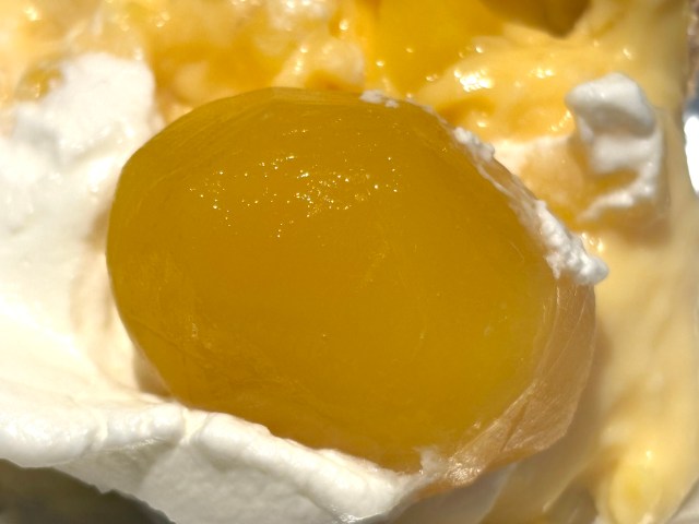食べて驚いたのが、まず生クリームの軽さ。緩さから察するに、脂肪分が少し控えめにしてあるのではなかろうか。