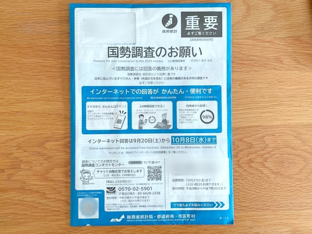 調べてみたところ、国勢調査のインターネット回答が導入されたのは2015年で、現在は紙ではなくインターネット経由が推奨方式になっている模様。