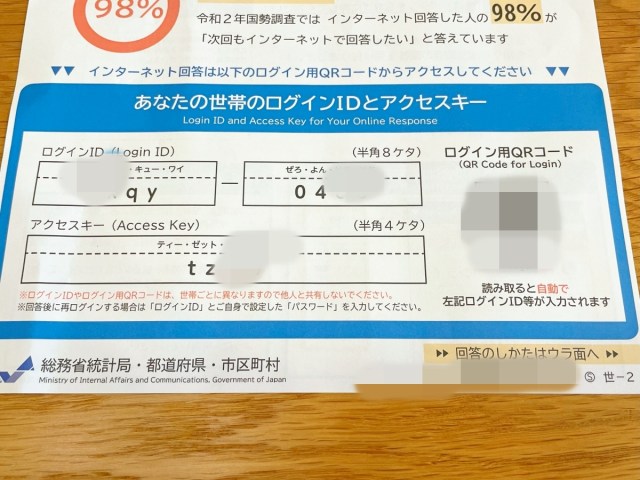 封筒内のインターネット回答依頼書には、私の世帯のログインIDとアクセスキーが書かれていた。こういう国とか自治体のオンライン申請って、IDを入力するのもいちいち面倒なんだよな……。