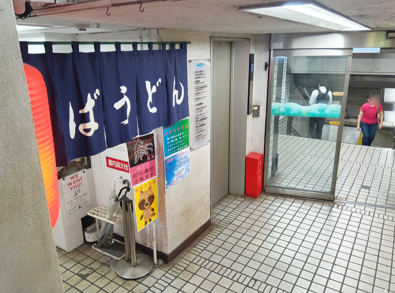 そんな喫煙所を横目にロータリーを渡り切ると名店ビルがある。地下鉄直結で飲食店などが入っているこのビル。地下への階段を降りると、目の前に地下鉄の通路への接続部が現れた。その自動ドア前の踊り場のような隙間に立ち食いそば屋がある。何を隠そう、ここが立ち食いそばマニアに話題の店なのだ。