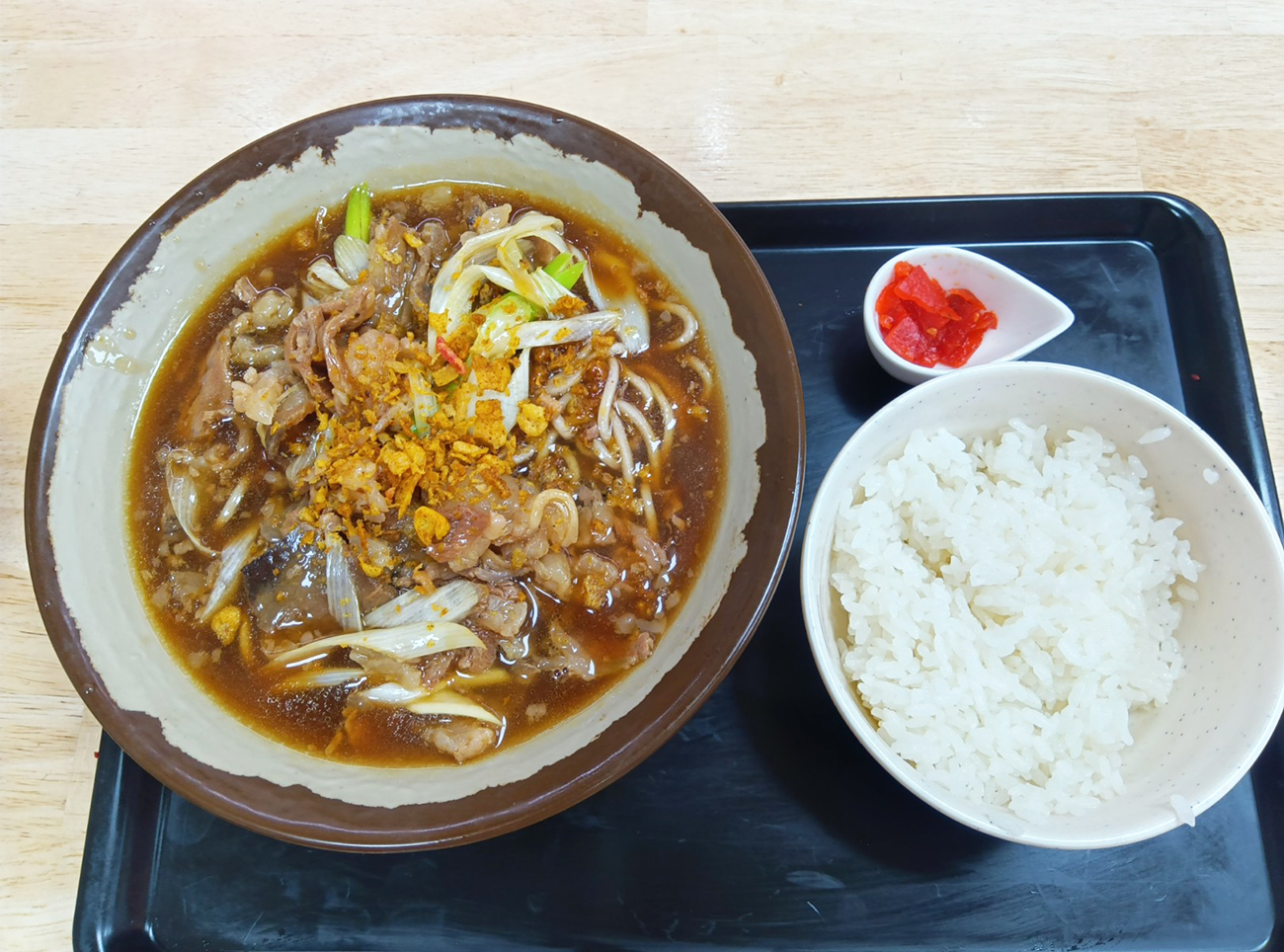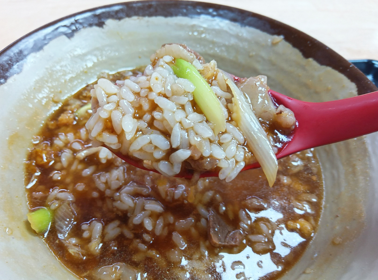 前述の通り、私は関西出身なのでカレーも肉そばも牛肉派なんだけど、東京で肉そばの肉が牛肉なことってほぼない。ゆえにこの店の牛肉カレーが刺さりまくった。牛肉の旨みとつゆの甘みがめっちゃ合ってる。牛肉カレーそばの牛肉1.5倍は税込1020円だが、なんならご飯セット(税込1120円)いったった。