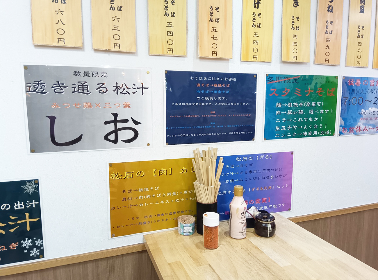 石田さん「まだ立ち食いそば業界は1年目なんですけど、かねてから料理人でして、醤油が大好きだったもので趣味で全国の醤油を取り寄せて刺身につけて食べ比べたりしてたんですね。その醤油の中からこの店で取り扱う麺に1番合うものを選んだという形です。なにせ蕎麦だけでも、粗挽き、田舎、白、黒と4種類あるので」