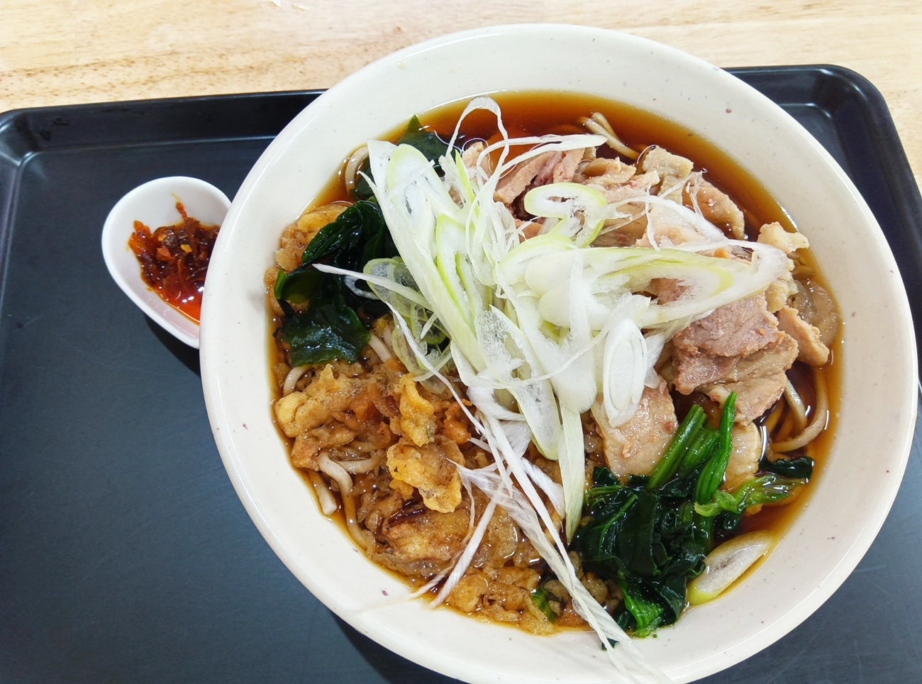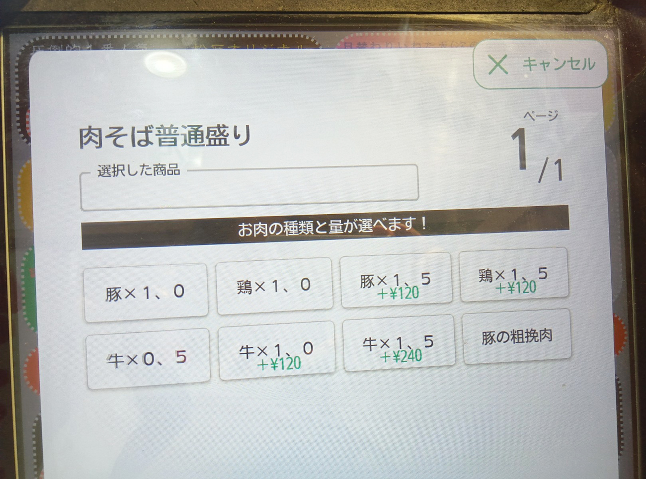 さて置き、関西のだし文化で育った私としてはベーシックのつゆがどんな味なのかをまず知っておきたい。そこで「肉そば 普通盛(税込630円)」を注文することに。ふむふむ、肉は豚、鶏、牛から選べて1.5倍とかもできるのか。「豚×1.5(+120円)」でファイナルアンサー。