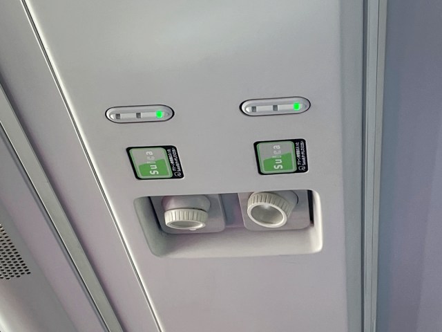 運よく並びの席が空いていたので、子供を窓際に座らせた後、スマホを座席上方のグリーン券情報読み取り部にタッチ。とりあえず私の分だけ先にランプを緑(着席)にした。