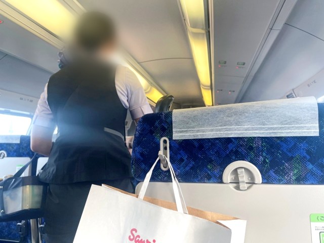荷物等を整理していると、ちょうどそこにアテンダントの女性が車内販売で通りかかったため、子供のグリーン券のことで声をかけようとした……次の瞬間。逆に向こうから話しかけてきたではないか。