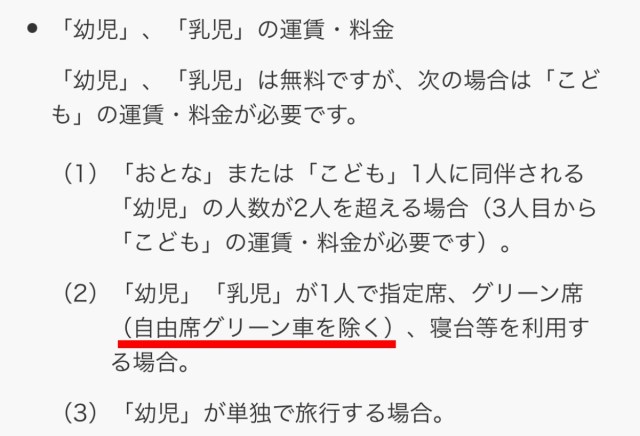 ・今回のような自由席グリーン車:大人1名につき2名までなら「幼児」「乳児」が座席を占有しても無料。