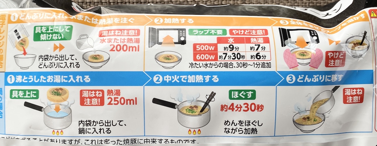 やり方としては内袋から出してどんぶりに入れ、そこに水、または熱湯を200ml注ぐ。それからレンジに放り込んで加熱するだけ(ラップ不要)でOKとのこと。