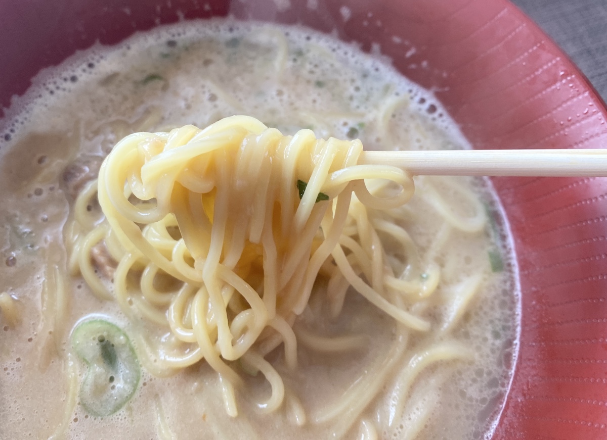 麺の方は細ストレートの柔らかめでやや冷食感あり。とはいえ、歯応えの主張はそんなになくスープとの絡みも浅めだから全体的に食べやすい印象を受けた。