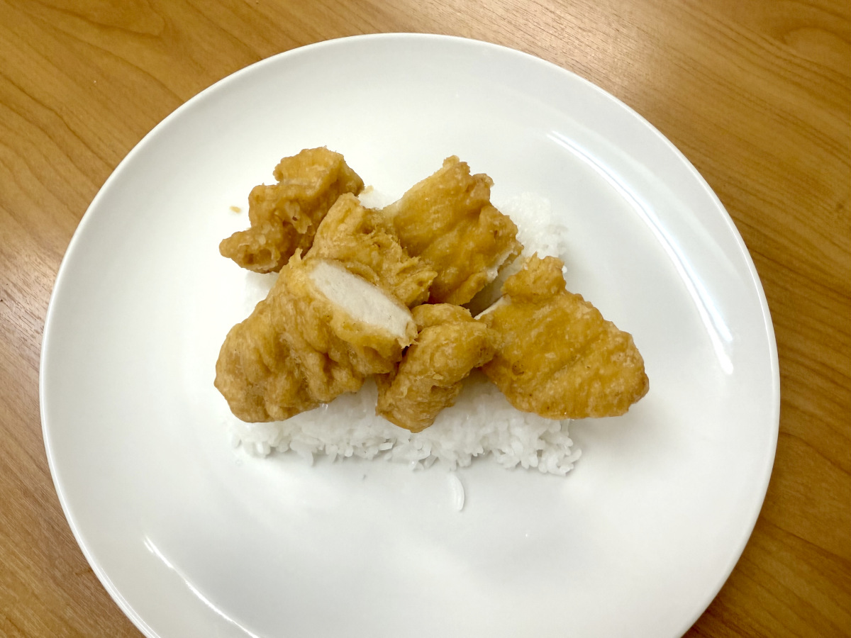 2: 適当な大きさにカットしたカーネルクリスピーをライスに盛り付ける。
