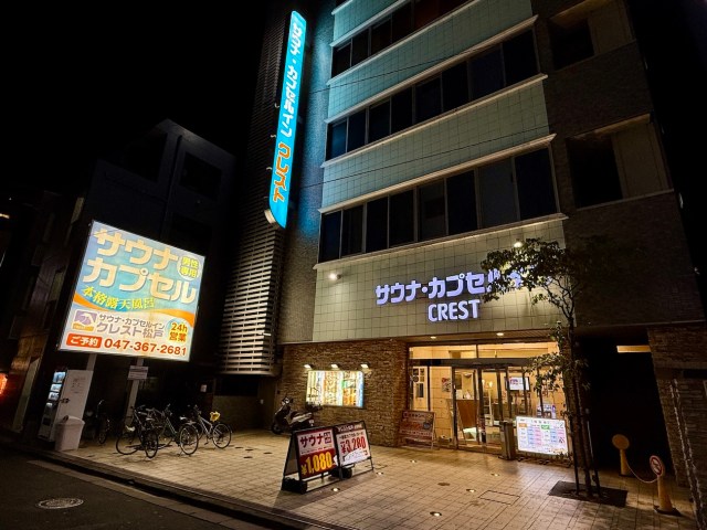 歩道橋(ペデストリアンデッキ)を降りてスグに現れるのが「クレスト松戸」。看板には「大浴場・サウナ・カプセル・休憩室──くつろげる癒しの空間」と書いてあった。サラリーマンの天国ここにあり。