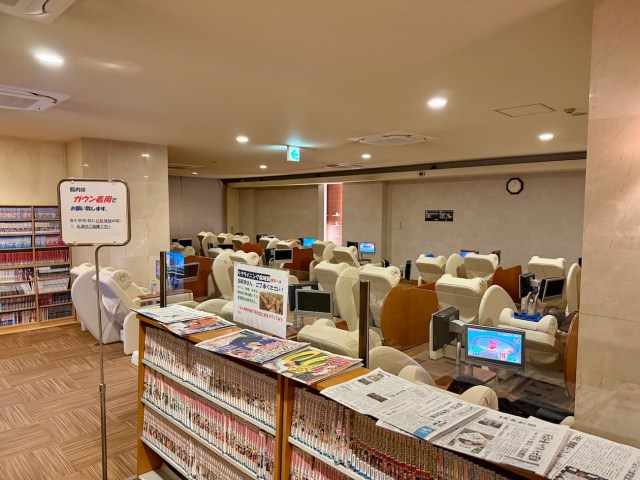 入浴後に館内をひと通り見学することに。休憩室(4階・地下1階)にはリクライニングシートがズラリと並び、テレビや漫画も見放題。Wi-Fiや電源もあるので、仮眠や作業スペースとしても使えそうだ。