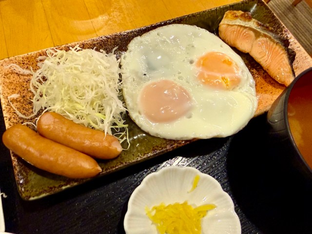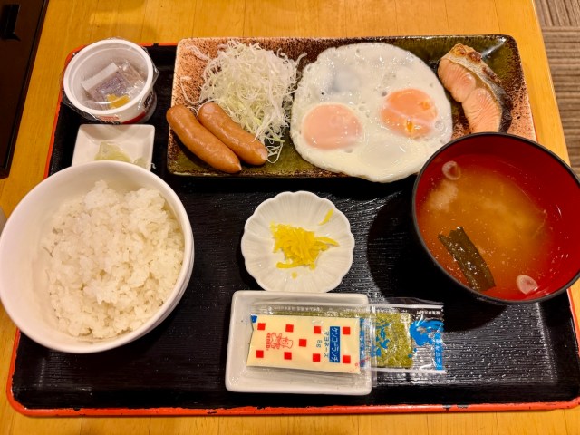 私が頼んだのは「和定食(750円)」。目玉焼き・焼き魚・ウインナー・納豆にご飯と味噌汁という、ザ・日本の朝食セットだ。ボリュームもしっかり目で、食べれば自然と気合いが入る。