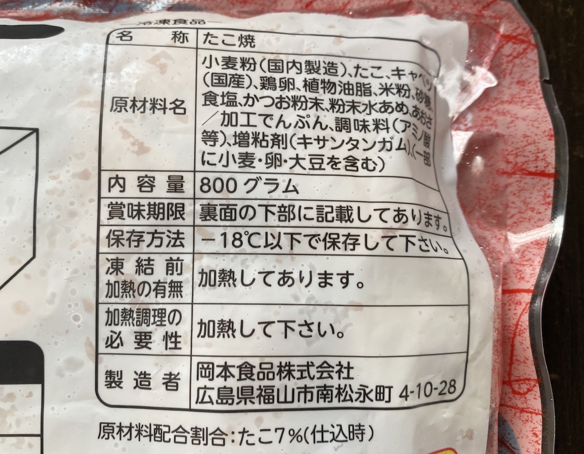 製造しているのは広島県福山市にある岡本食品株式会社。そうなると何がそこまで安くなるのか不思議で、同時にたこ焼きのクオリティーが気になったが……