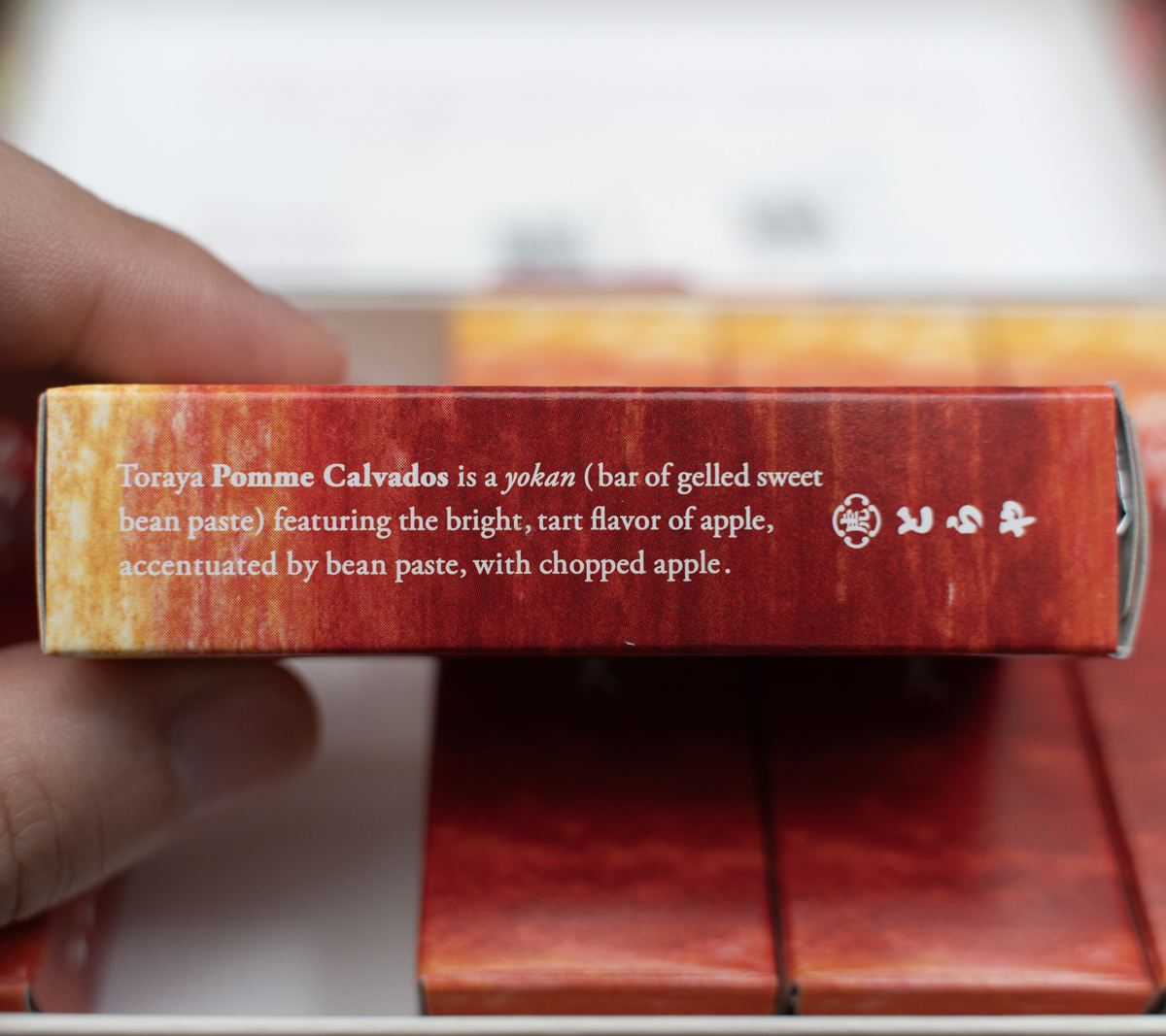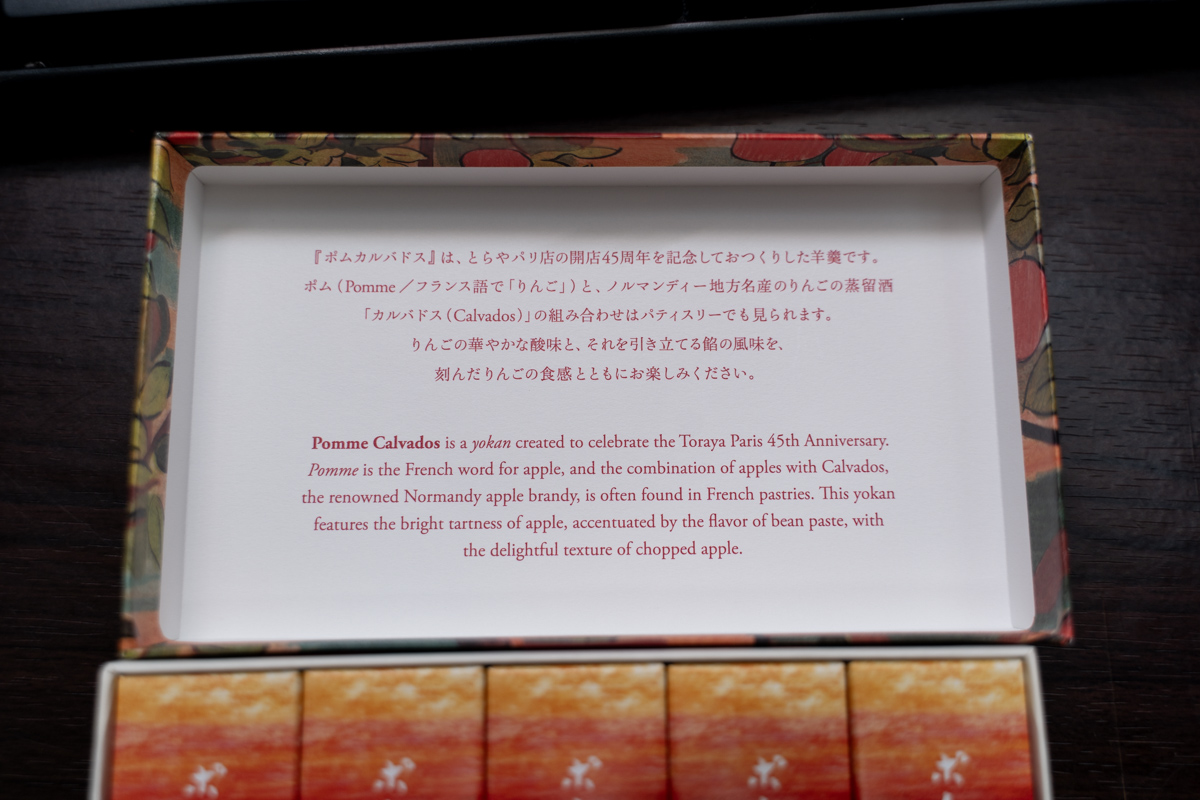 日本語と英語で解説が書かれている。林檎とカルバドスを合わせた羊羹だそう。外箱に描かれていたオレンジ色の木の実がポムなのだろう。
