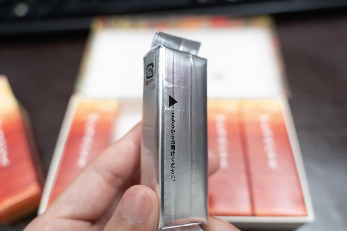 羊羹本体の個包装用の箱側面にも、簡単な説明が書かれている。日本語でも書かれているが、必ず英文でも書かれている点にグローバルみを感じる。