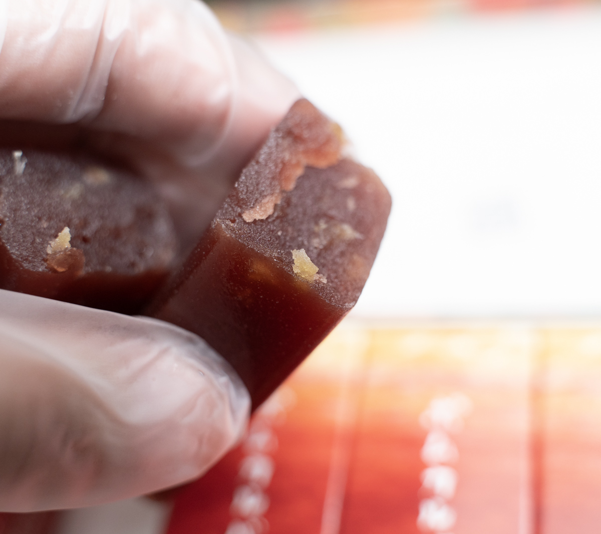 羊羹というものは、内容物の香りが出にくいタイプの菓子だと思う。それでもフワッと林檎が香り、期待が高まっていく。よく見たら半透明の内部に何か、黄色いものが見えるな。