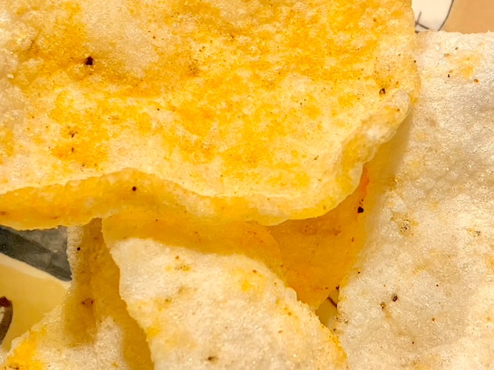 一枚一枚がびっくりするくらいソフトな食感だ。サクサクとした音が心地よく、一応揚げ物のはずなのに何枚でも食べられちゃいそう。