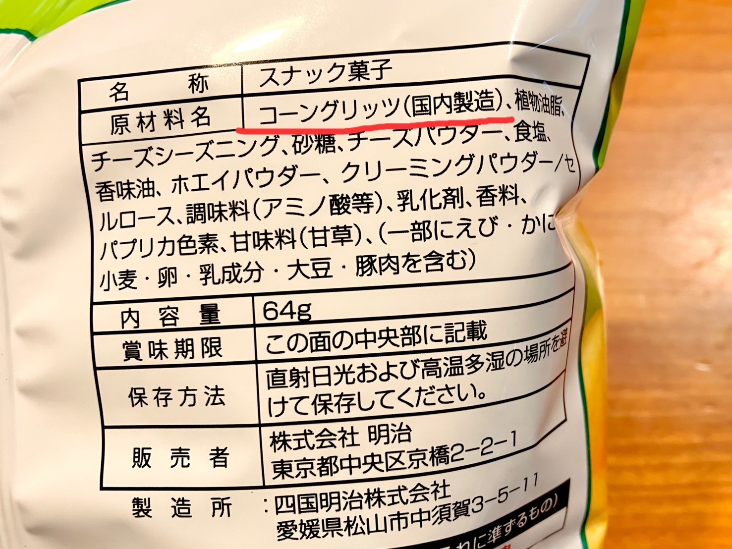 カールは「コーングリッツ」つまりトウモロコシで作られているようだ。お米と比べるとトウモロコシの方が甘みが強いもんな。