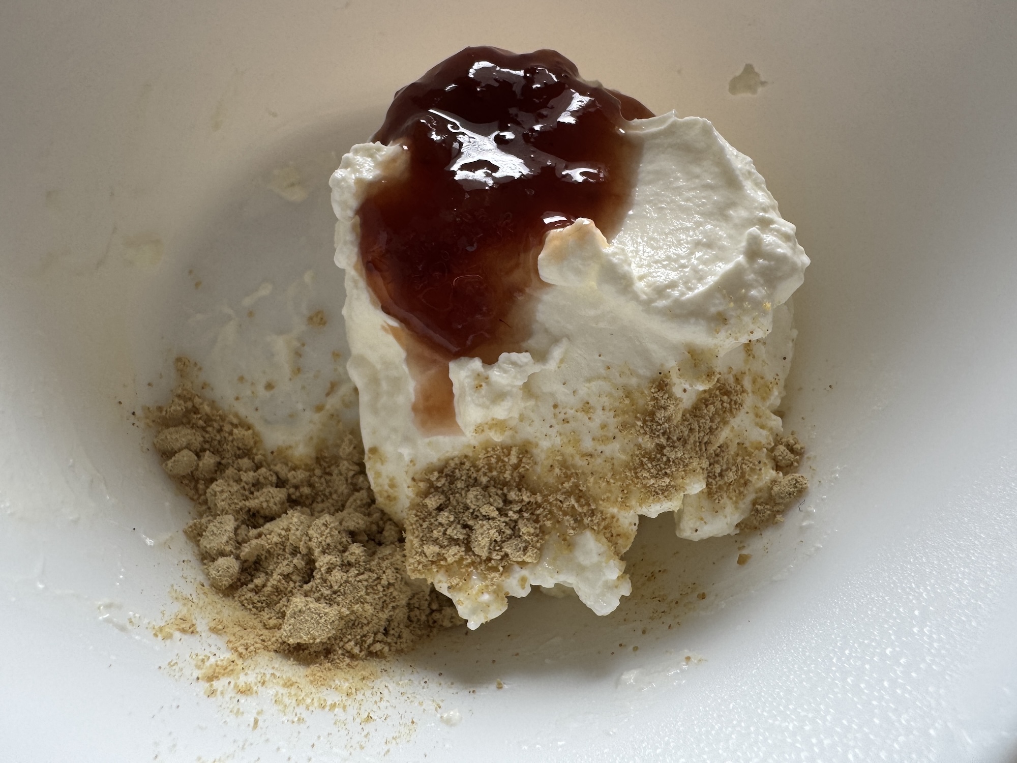 ▼ヨーグルトにジャムとナンメの青豆粉をかけたヤツごっつウマい
