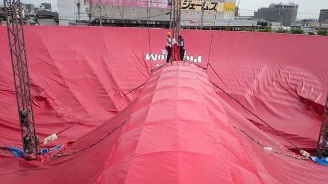 約半日かけてテント内の作業を終えると、いよいよテントを下ろす段階へ。巨大な幕を地面まで下ろし、内と外の両側からベルトでガチガチに固定。暴風にあおられても絶対に飛ばされないよう徹底的に引っ張り込む。
