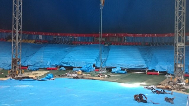 作業はテント内の片付けから。照明器具を下ろし、客席にはブルーシートや毛布を敷き詰めて徹底的に養生。さらに台風で雨水が吹き込むことを想定し、テント内には水中ポンプを複数台あらかじめ設置しておく。