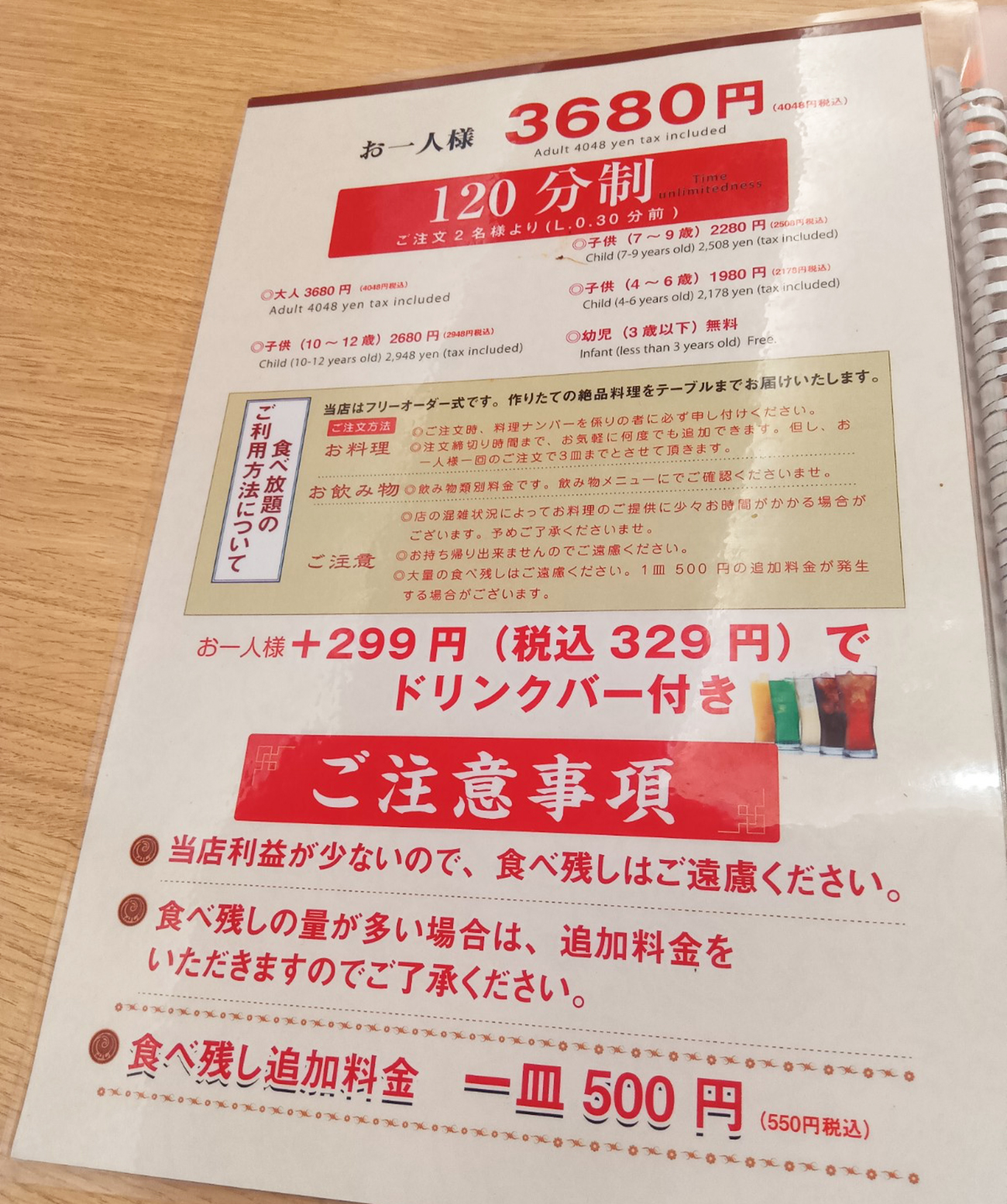 看板をよく見てみると、3680円は税抜き価格で、税込4048円という価格が小さく書かれている。さらに「100品以上」「120分制」との文字も見て取れた。