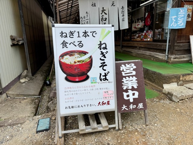 店頭の看板には「ねぎ1本で食べるねぎそば」と書いてある。「ネギで食べるならうちですよ」というアピールなのか。調べたところ、大内宿にねぎそばは10軒以上あるらしい。ともあれ、早朝から営業している店舗は少ないようだ。