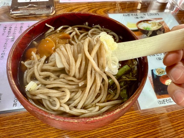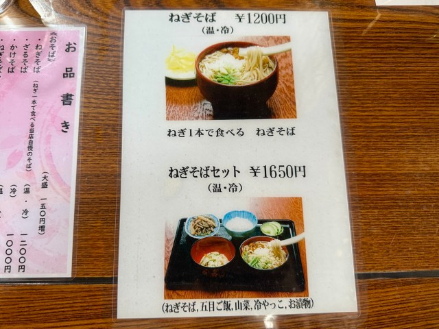 外でも食べられるようだが、囲炉裏のある店内の方があたたかそうだったので座敷席へ。さっそく注文したのはもちろん「ねぎ1本で食べる ねぎそば・温(1200円)」。どう考えても食べづらそうな見た目が逆にそそられる。