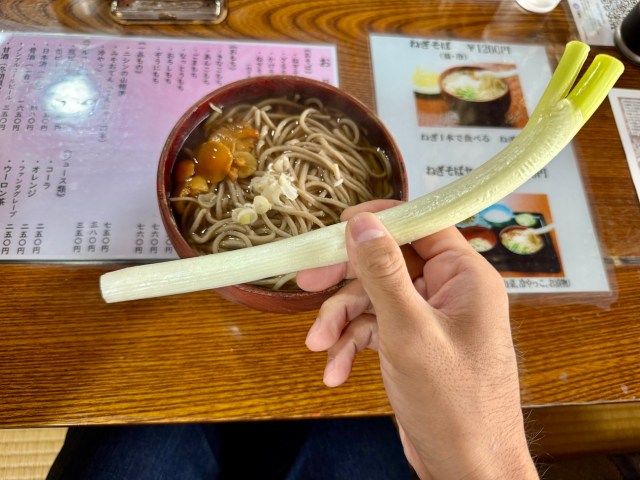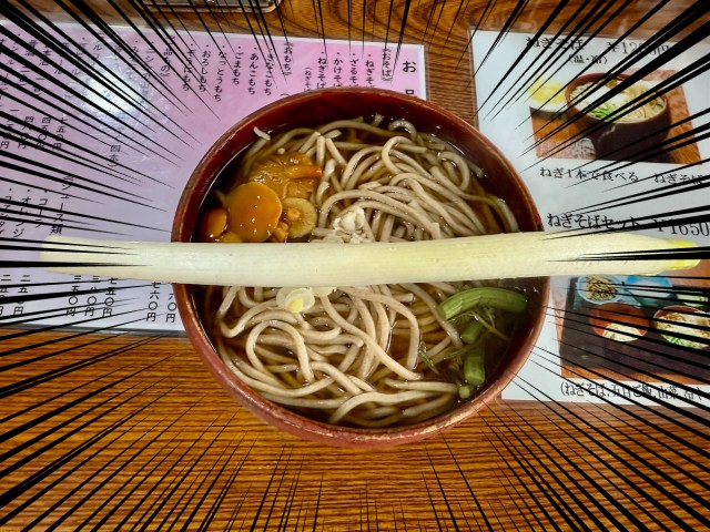 大和屋の「ネギそば」だ。聞くところによると、器に長ネギが丸ごと1本のっているらしい。箸の代わりにネギを使ってそばをすするそうだ……ちょっと意味が分からないが、昔からの風習なのだろうか。実際に食べて確かめてきたので報告したい。