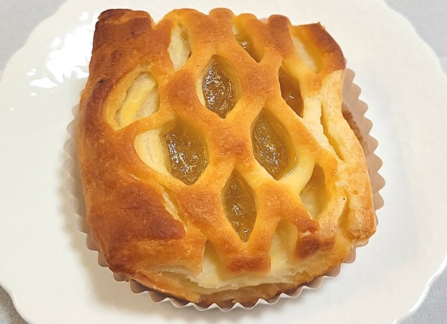 食感の構造が対照的な、「デニッシュメロンパン」と「チーズケーキデニッシュ」の2品。そこへ極めつけに、3品目の「アップルパイタルト×クイニーアマン(税込198円)」がさらなる展開をもたらす。