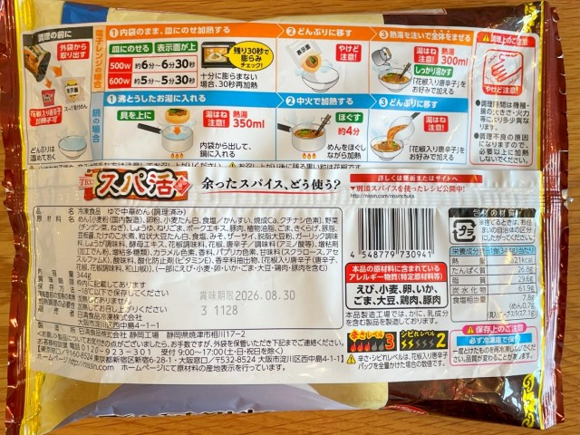 それでは実際に作ってみよう。中身はスープ・具付めんと花椒入り唐辛子。鍋でも調理可能だが、メーカー側はレンジ調理を推奨している。